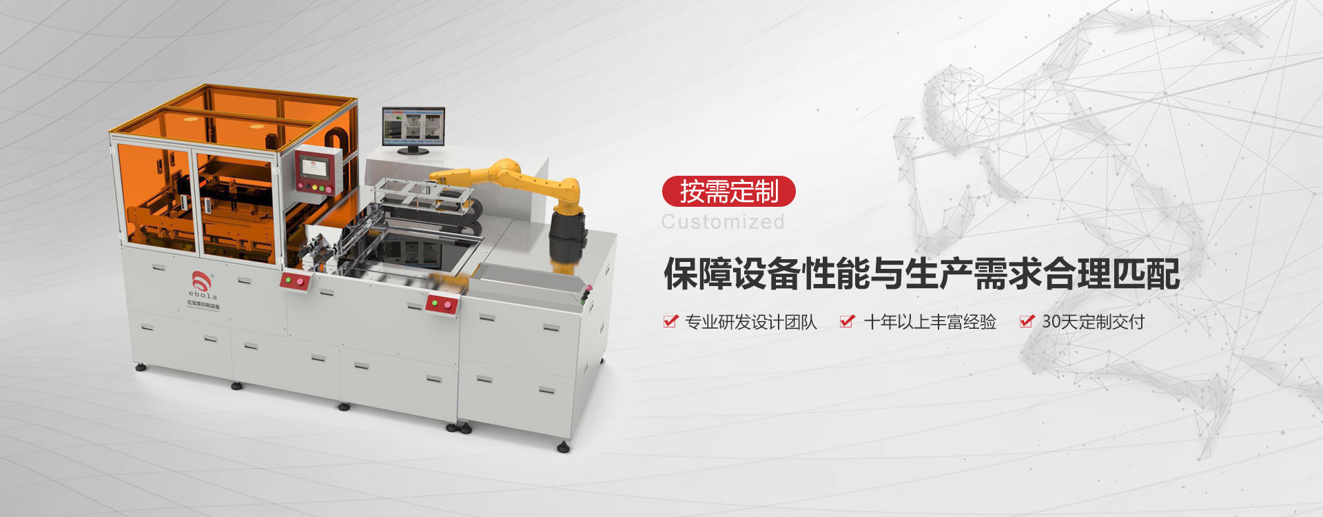 億寶萊印刷設備有限公司2008年成立于深圳,是一家專注于絲網(wǎng)印刷機以及相關配套設備制造、銷售的專業(yè)化印刷設備綜合服務商,公司共十大類100多個品種的產(chǎn)品廣泛服務于禮品包裝、電子、PCB、光伏光電、生物、陶瓷IC線路等新型產(chǎn)業(yè)領域。